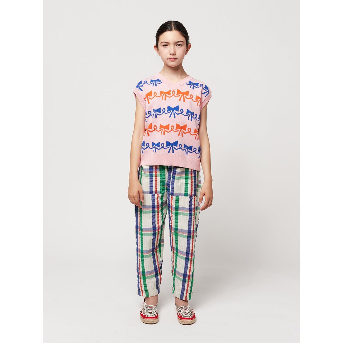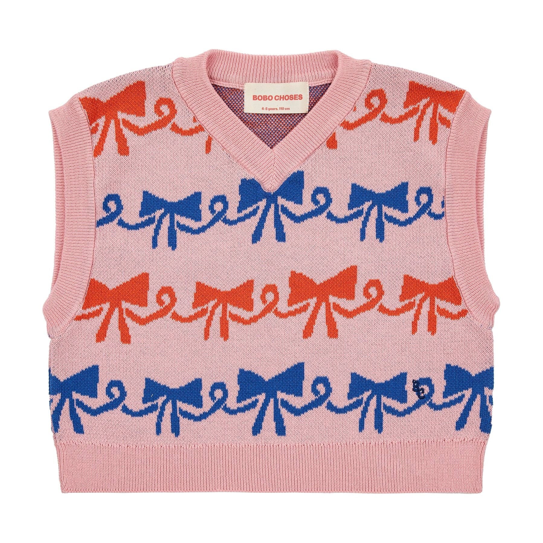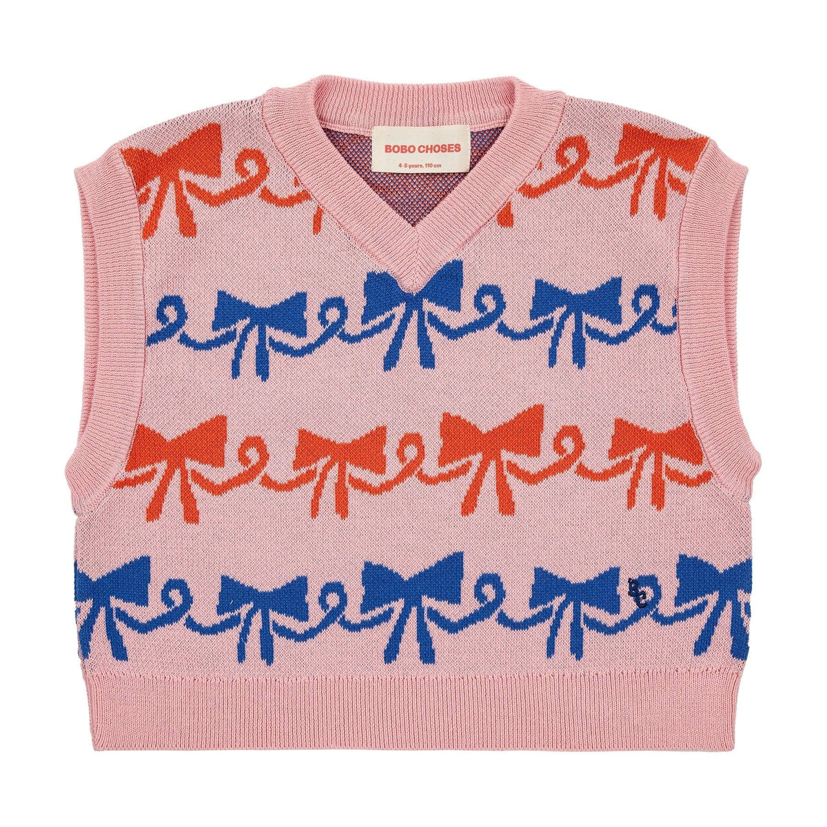 100% organic cotton pink jumper. Designed with v-neck, sleeveless, embroidery, jacquard, loose fit, cropped fit and ribbed bottom. Made in Spain.