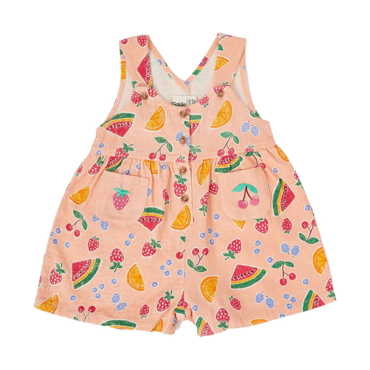 Hand drawn graphics. adjustable button straps, pocket at the front. Softens with every wash