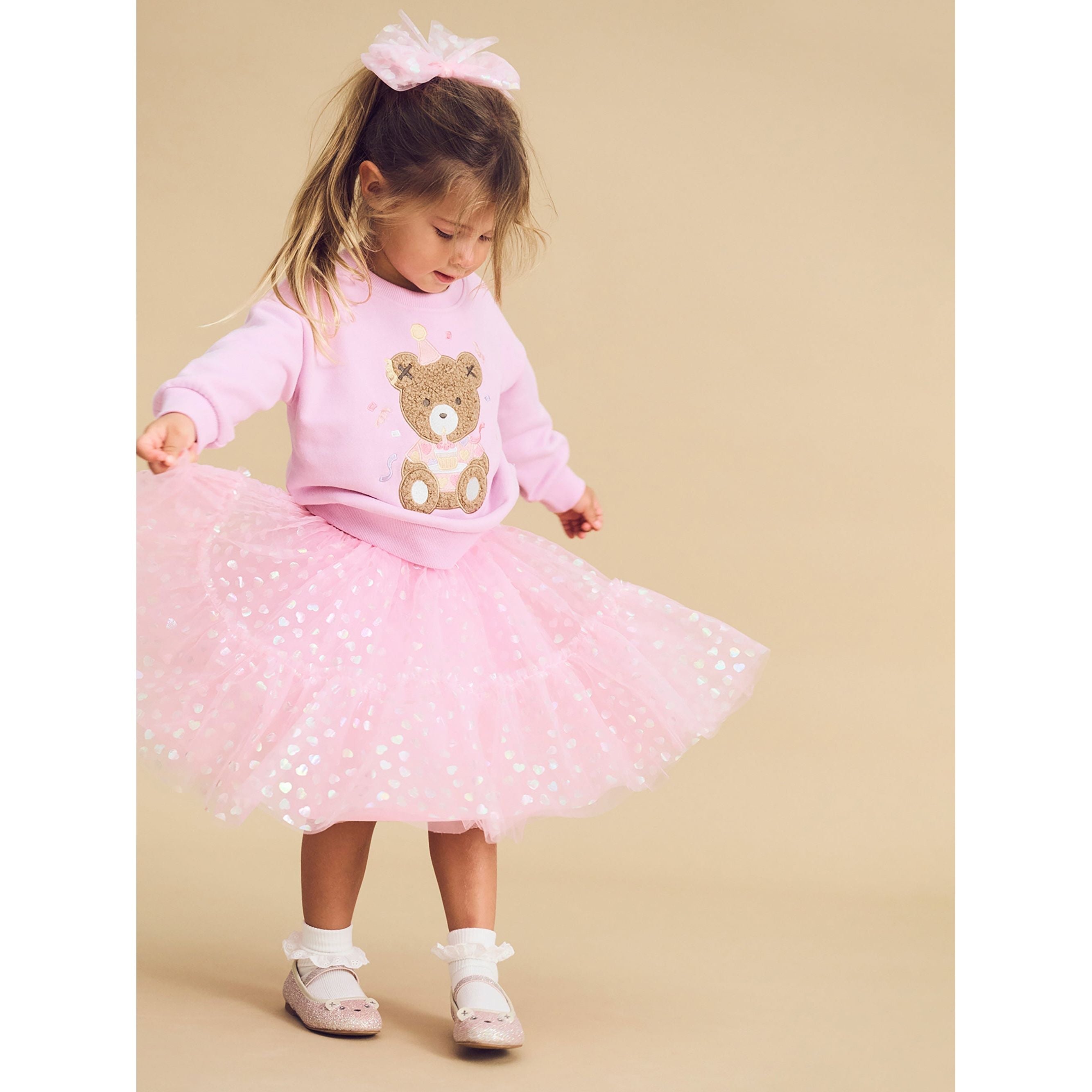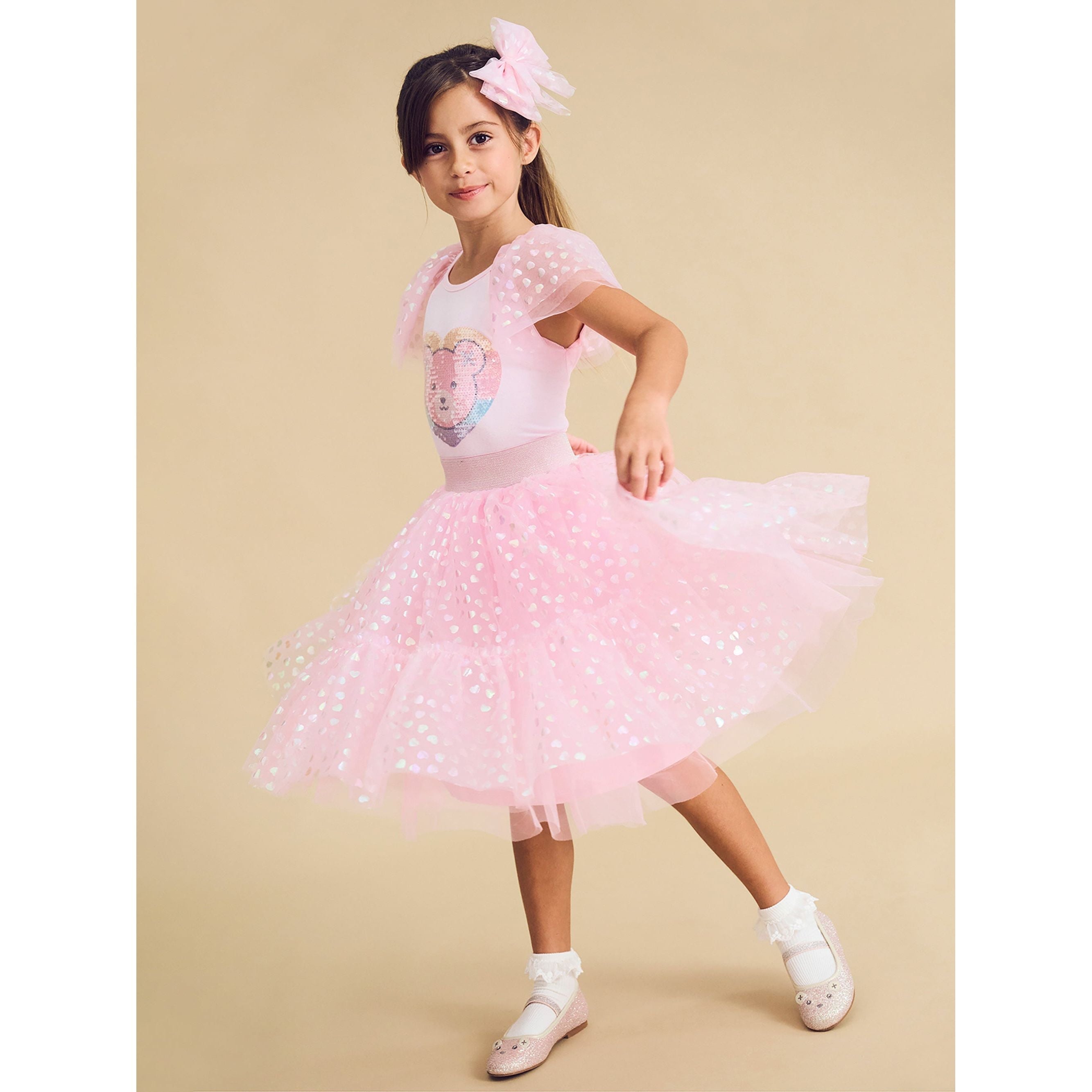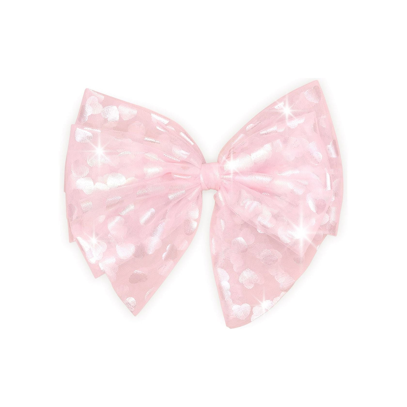 Super cute oversized tulle hair bow with all over iridescent heart print and clip