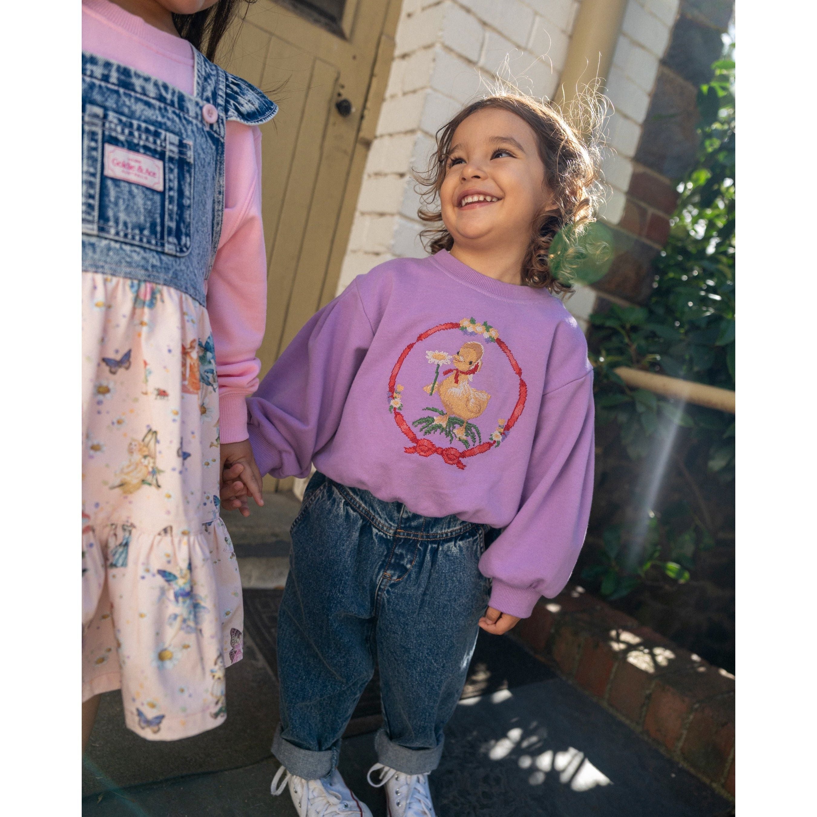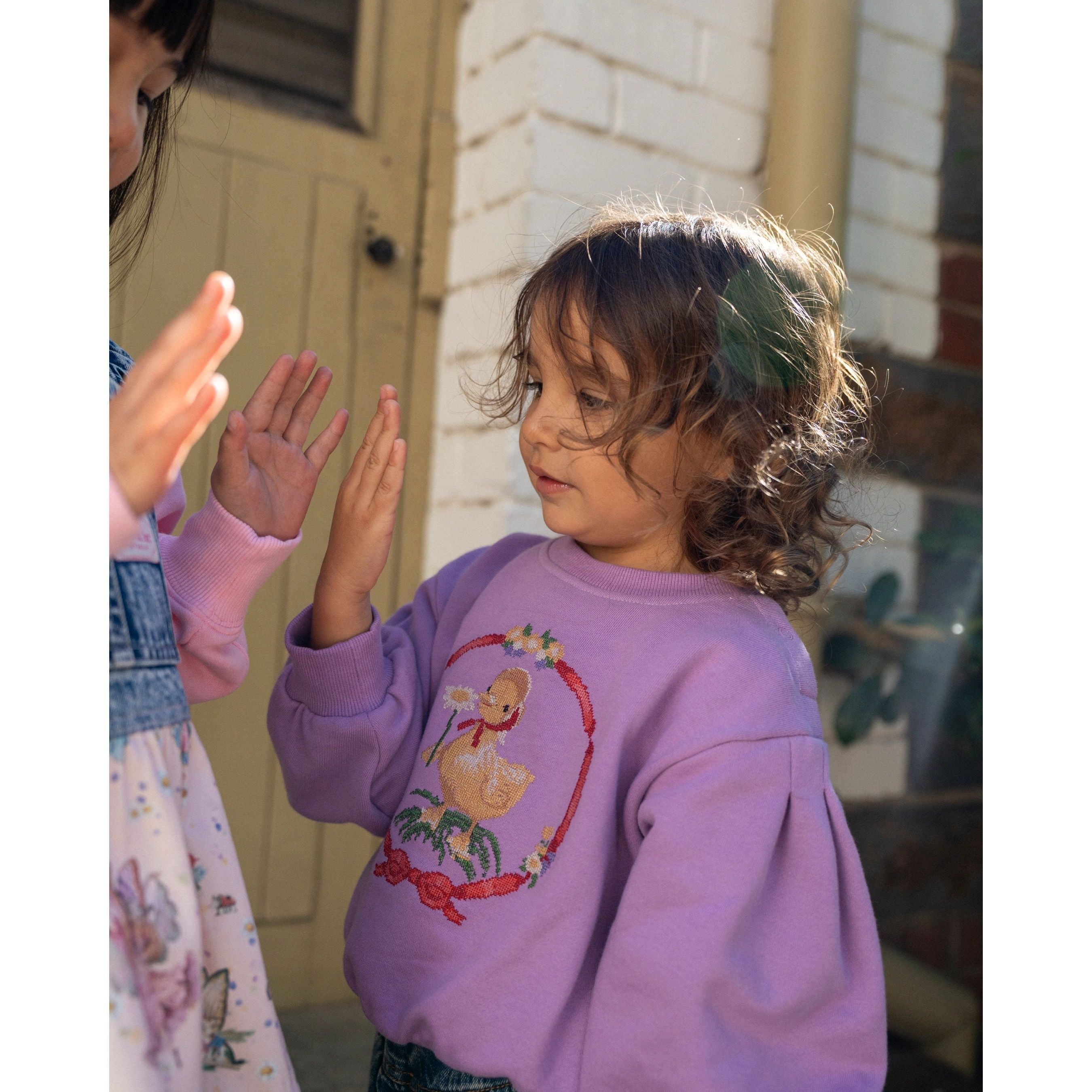 This bright purple terry cotton sweater features an 80s-inspired balloon sleeve and a charming Shirley Barber duck embroidered on the front — cozy, playful, and full of character for every child’s day.