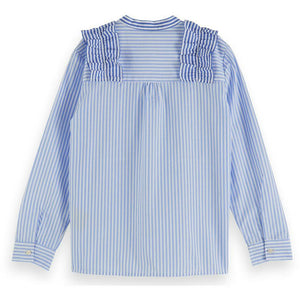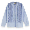 A wardrobe classic crafted with a twist. This crisp cotton shirt is given a playful touch with ruffled details and features a striped pattern that dyed right into the fabric. Cool right? The shirt has a collarless design and features contrast stripes at the neckline and button placket.