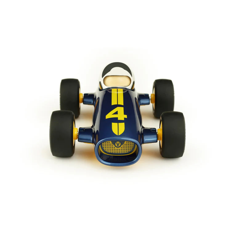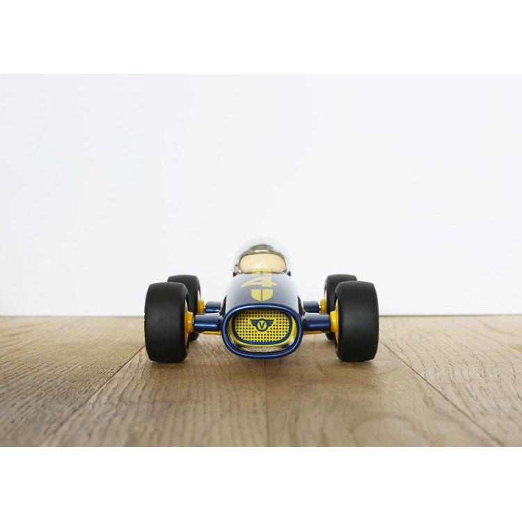 In metallic blue with yellow racing stripes and rims, Lucas is a sporty designer car reminiscent of the vintage Grand Prix car. Made from heavy-duty plastic with moving rubber wheels and a chrome helmet, Lucas is robust and solid and will bring years of joy to his new driving champion!