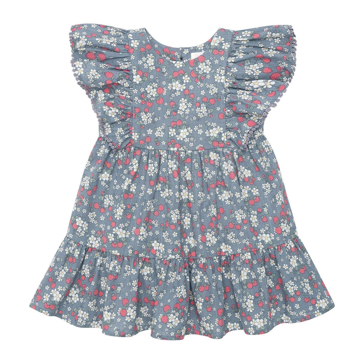 Super cute cotton ruffle pinafore dress with all over strawberry print and frill sleeves