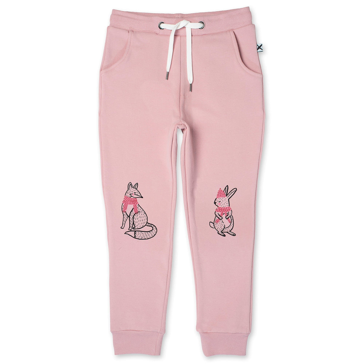 Girls straight leg trackies with front pockets, shoelace cord and 2x2 rib waistband and cuffs. 95% Cotton // 5% Elastane.