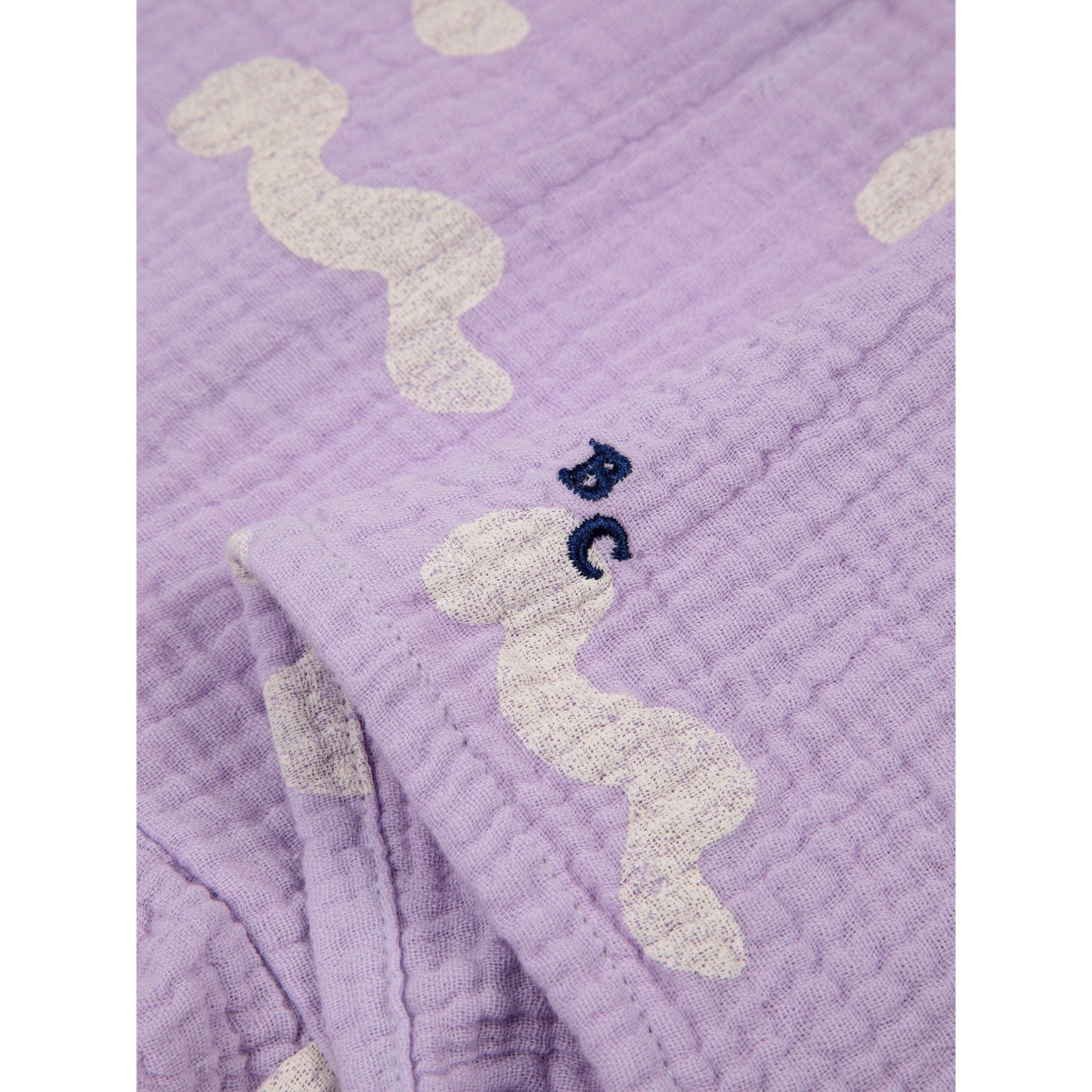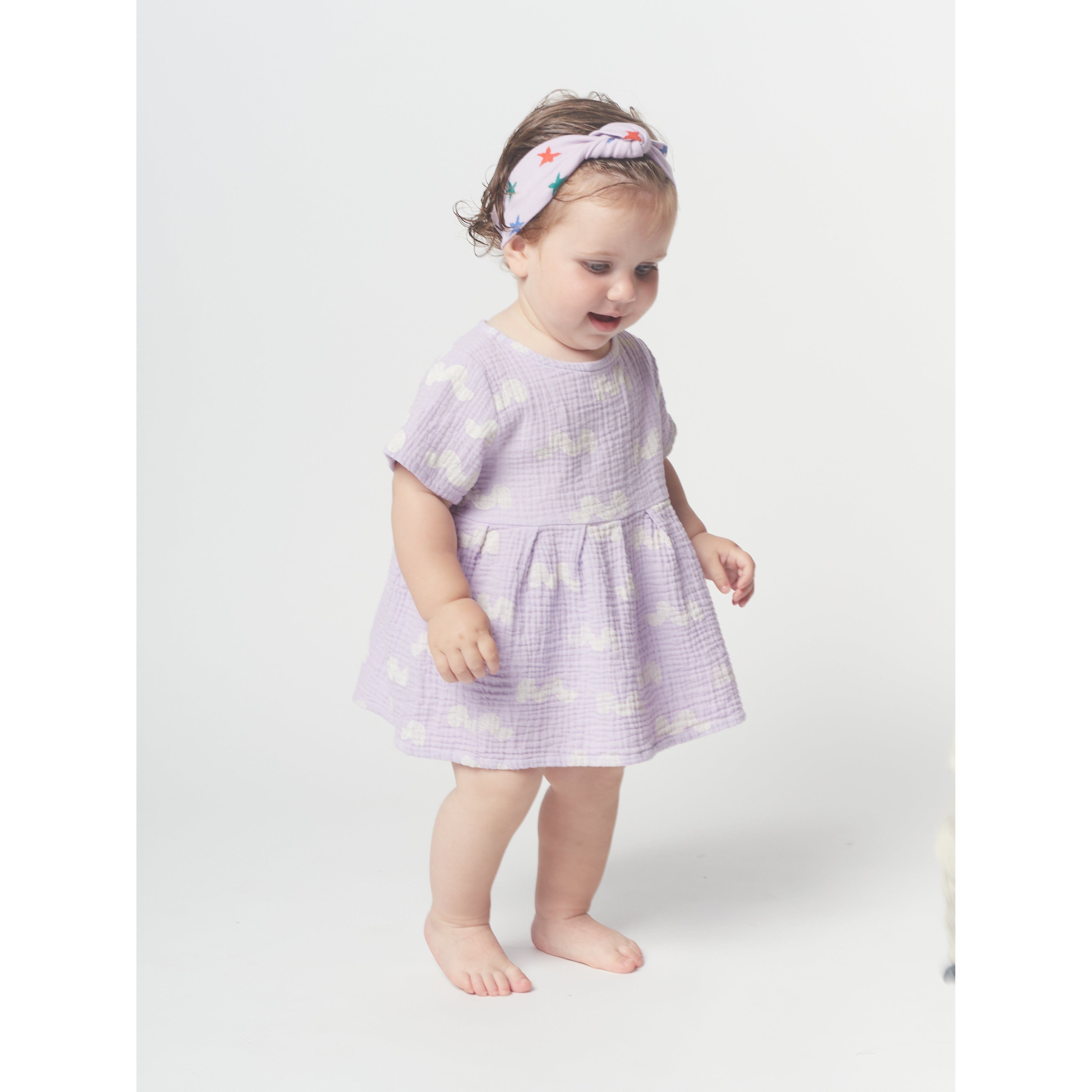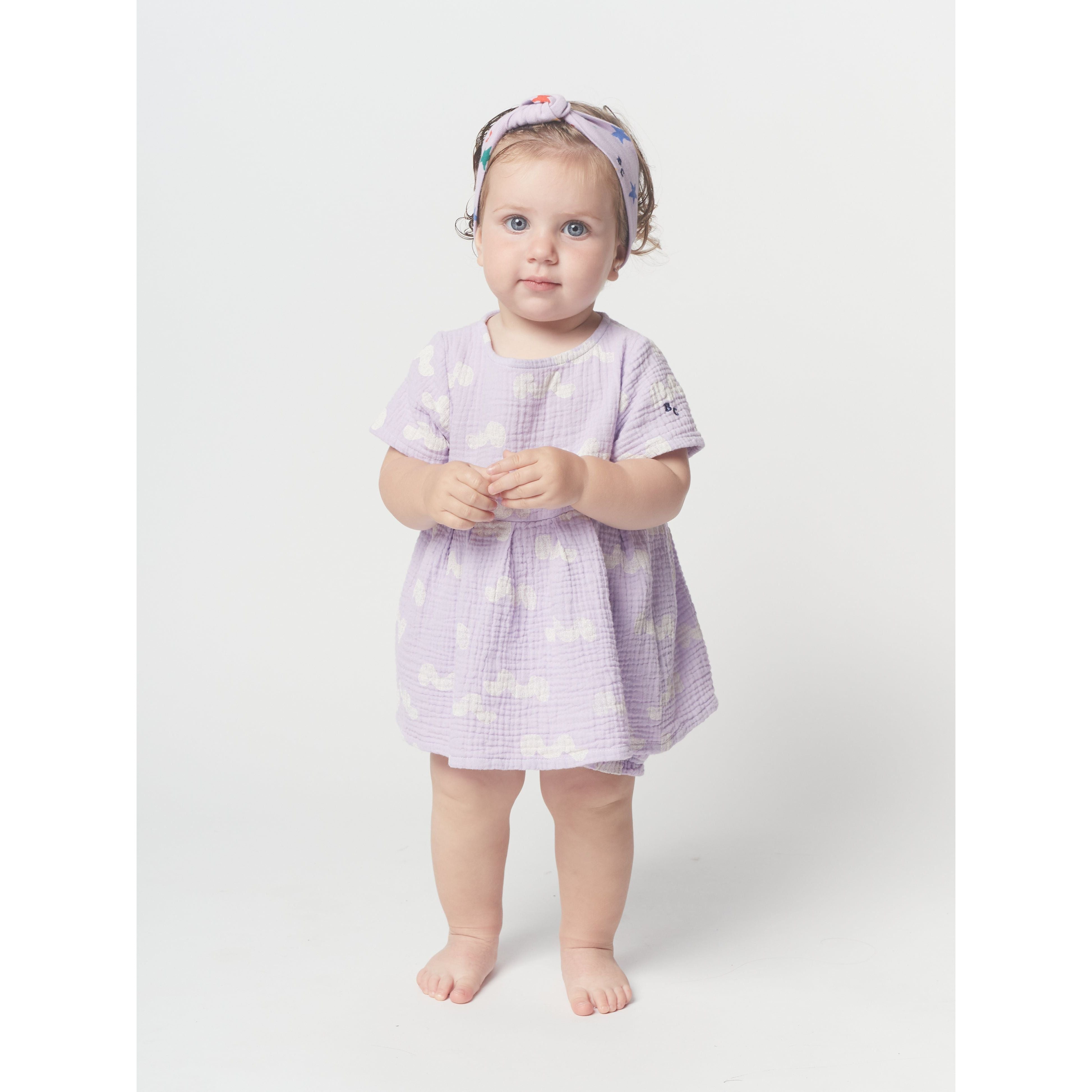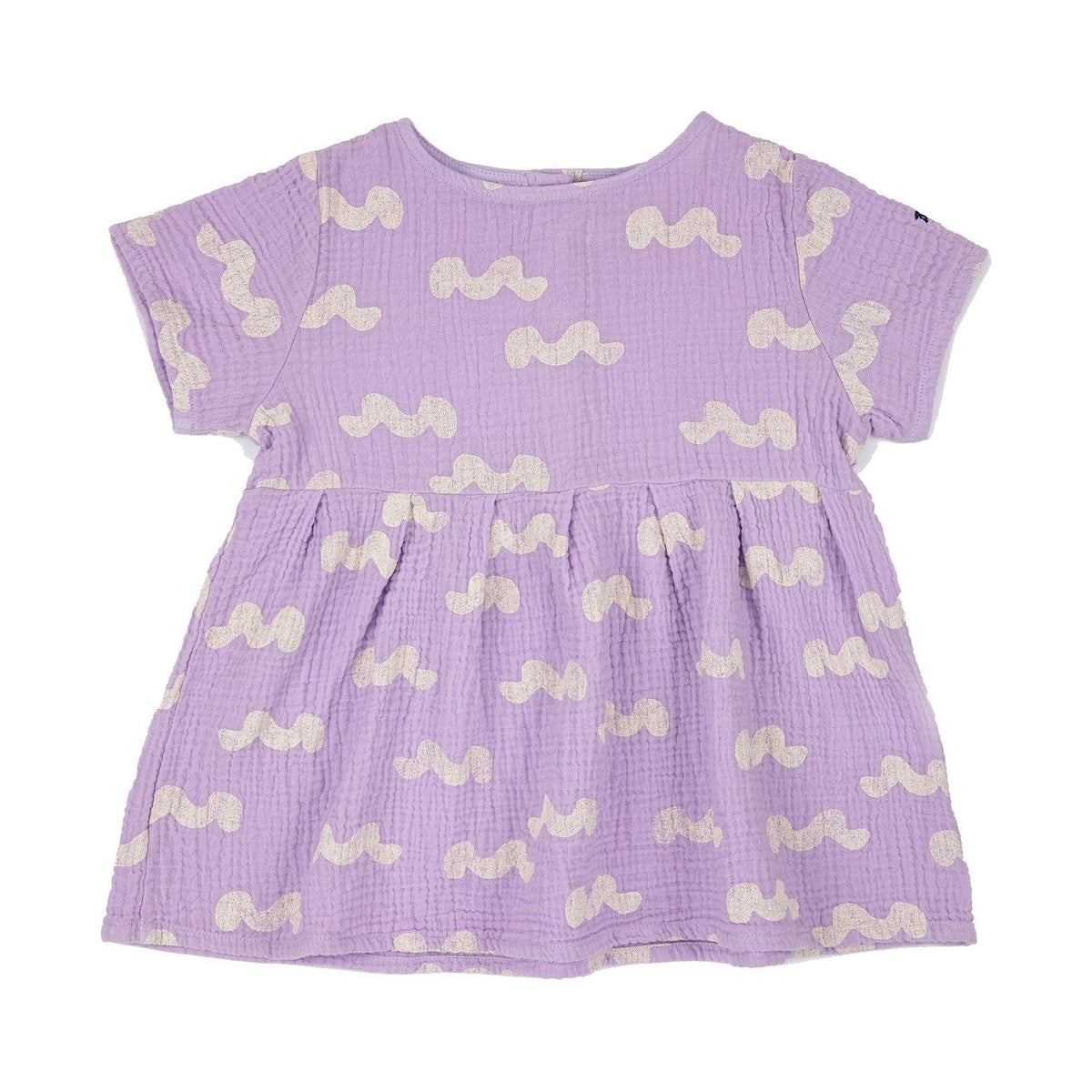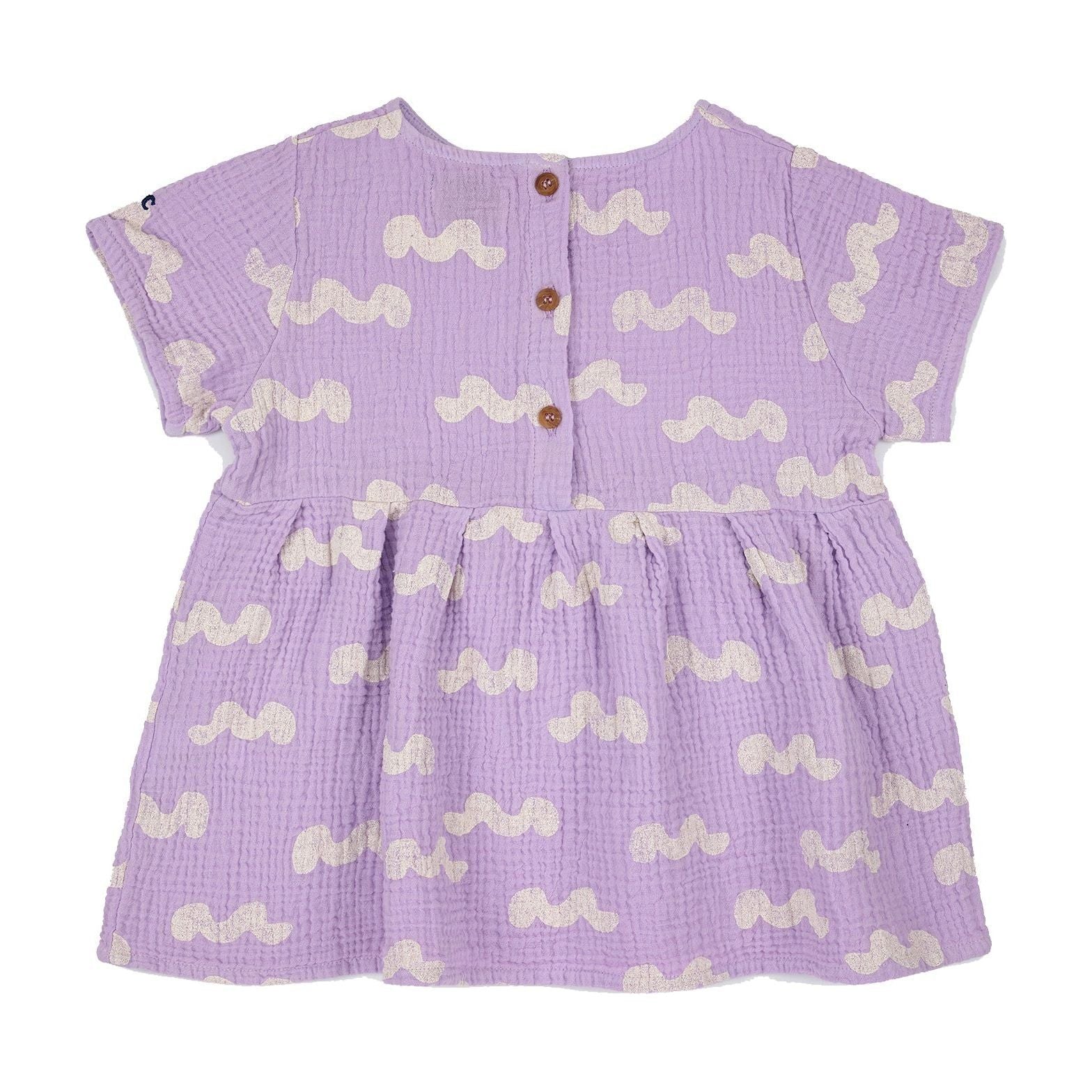 100% organic cotton lavender short sleeve dress. Designed with back button fastening and embroidery. It has a evasé fit. Made in Spain