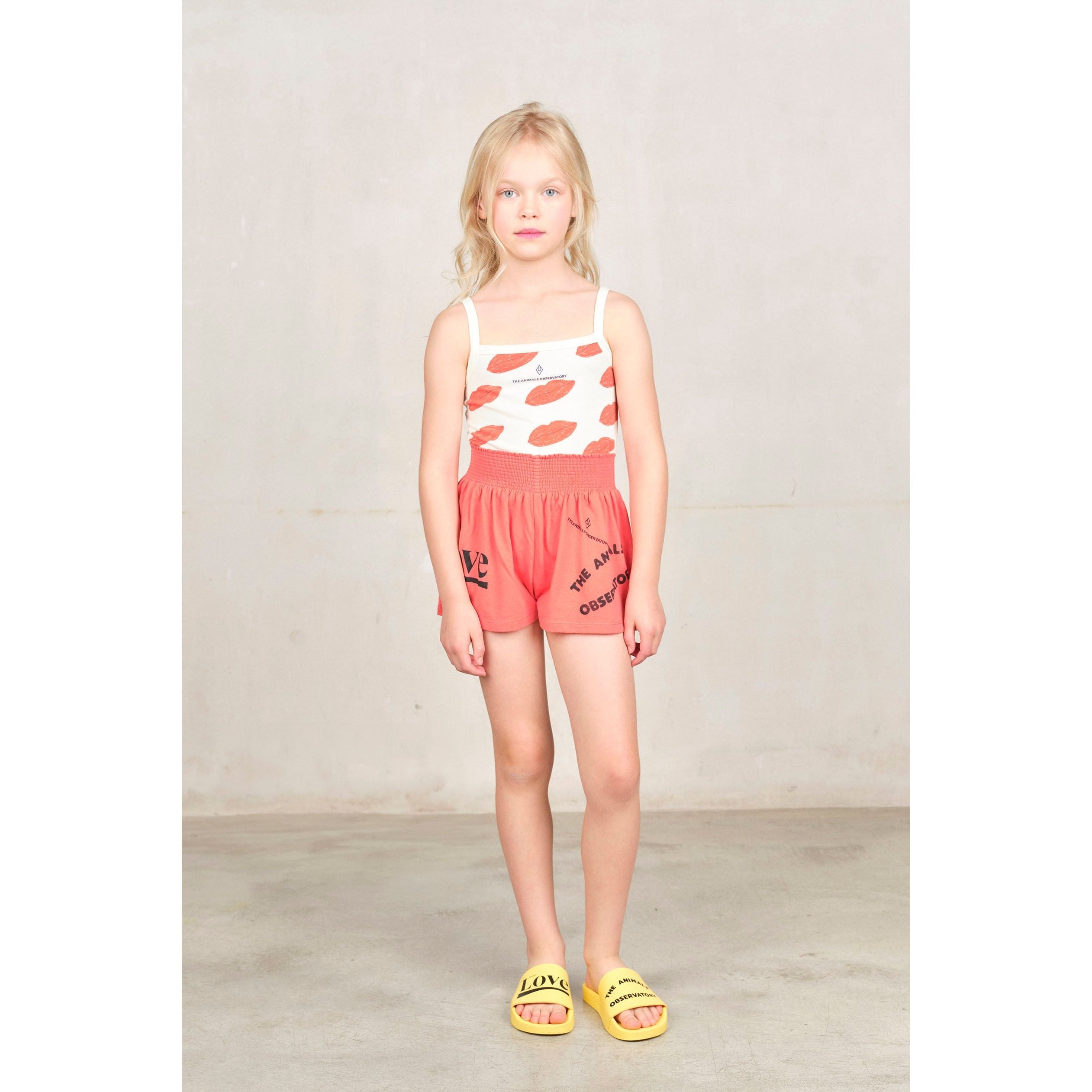 Tank Top with an orange kissing print. Soft, playful, adds fun to kids' outfits.