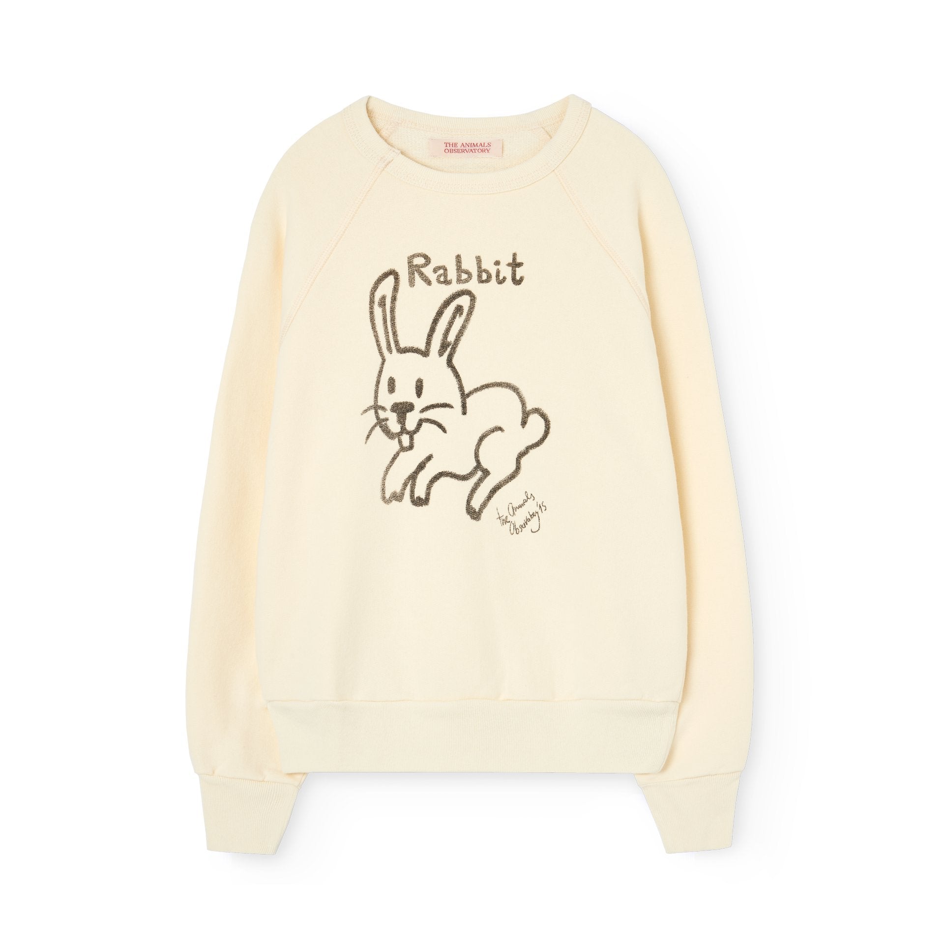 A raw white sweatshirt featuring a lively rabbit in motion, bringing a touch of playfulness and energy to every adventure.