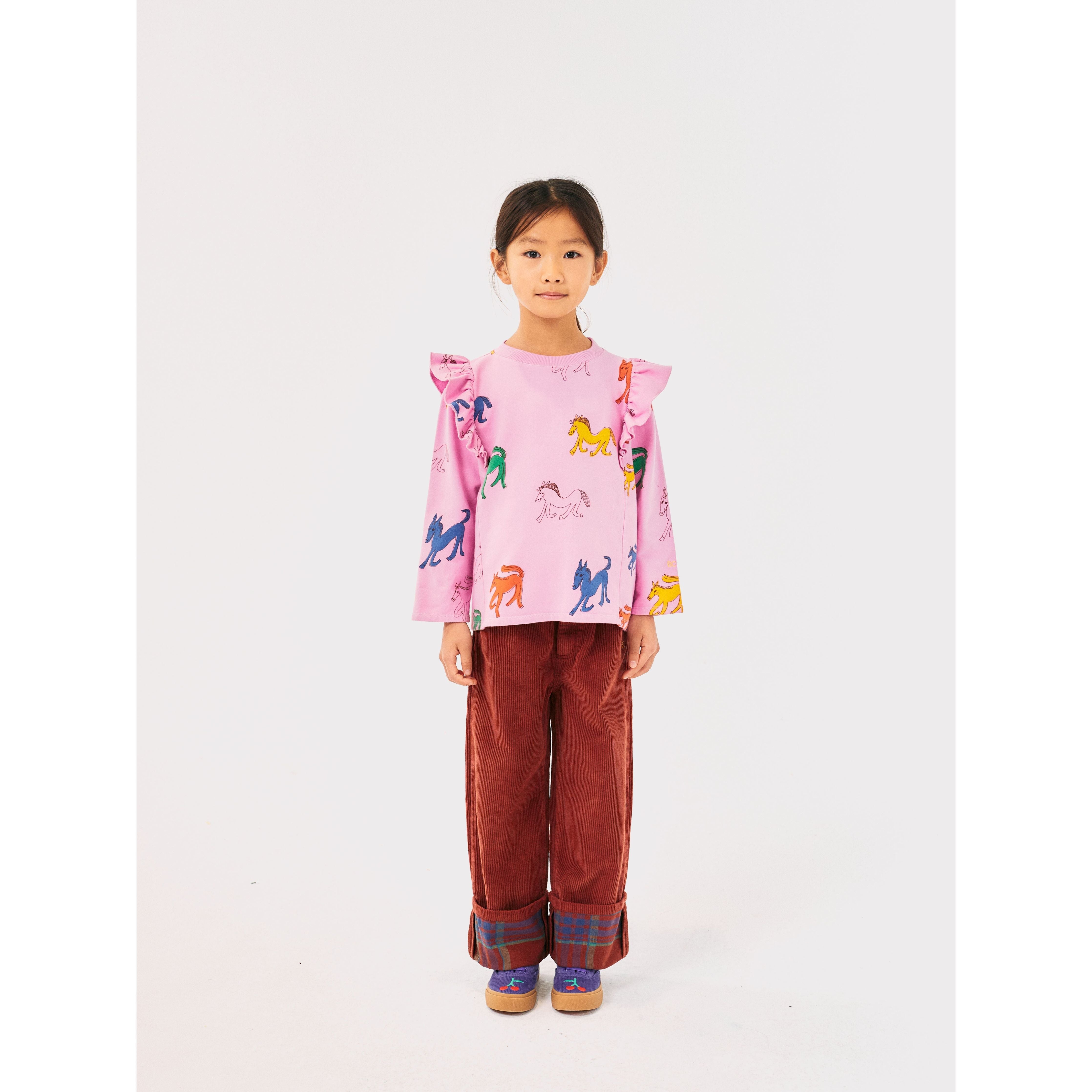 Designed with long sleeves, embroidery, loose fit, round neck, inner brush fleece and ruffled detailing
